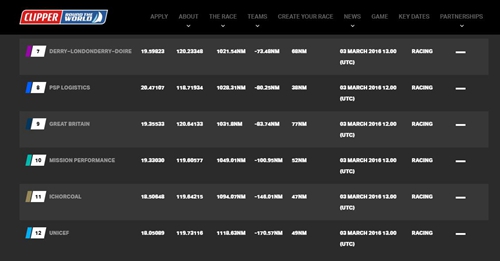 比赛排位 位列第三的青岛号船长Bob Beggs在报告中写到:“过去24小时的航行很激烈紧张,马上就要回到母港的船员们确实很拼。三次缩帆、接着上3号扬基帆、再上满帆、再换上寻风帆,这会儿又缩帆两次,然后又换上了支索帆,绝对闲不住、玩不够。过去24小时里风速从2节到最大瞬时56节不停的变化,大伙儿都绷紧了弦,青岛号的队员们干的确实漂亮。船舱里现在是又湿又热的,偶尔我们就床铺上悬空休息。差不多一个星期就能到家了,我们一定要坚持到底!” |