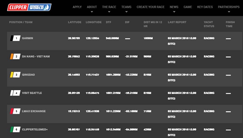 比赛实拍 克利伯环球帆船赛2015-16赛季的赛程8‘帆船之都•青岛’杯比赛进入第5日,参赛团队遭遇了本赛季开赛以来最为严峻的海况。过去24小时的比赛中,船队遭遇了强风大浪,航行困难。 先前领先的克利伯远程医疗号赛队选择了北线航行,目前已经落到了第六位,选择东线行驶的越南岘港号赛队目前位列第二,青岛号紧随其后位列第三。