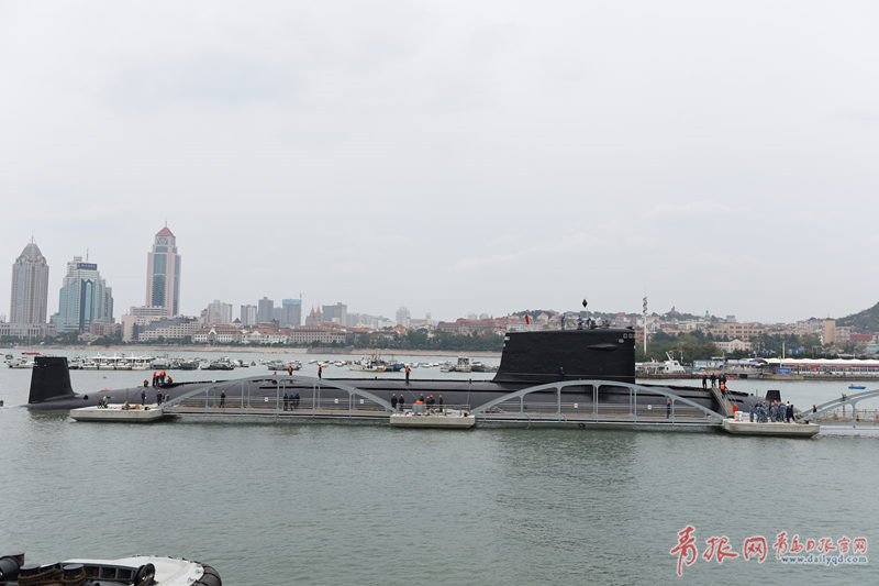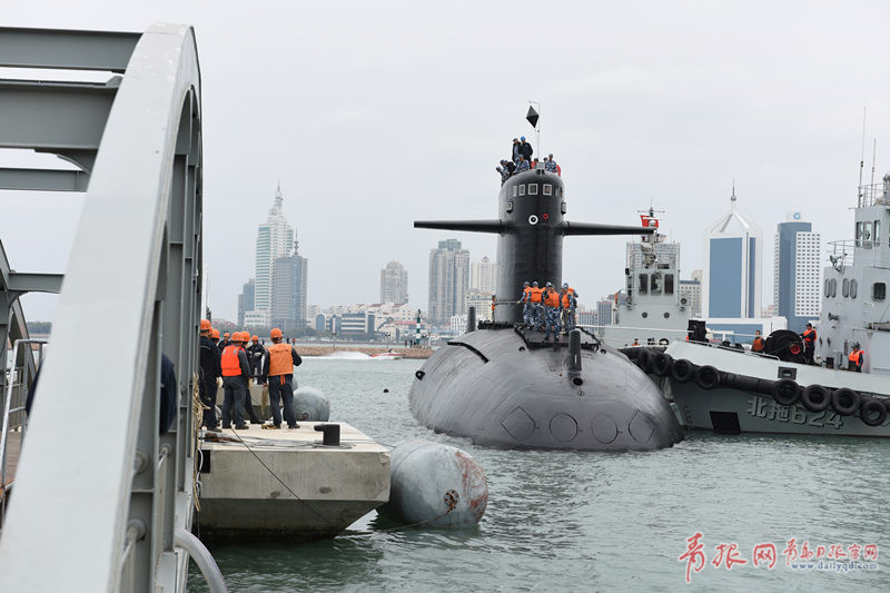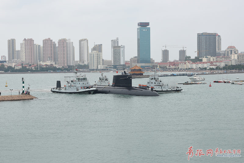 核潜艇在拖船的拖带下经过栈桥。来永雷/摄