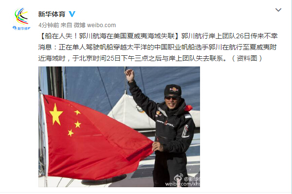 郭川航行岸上团队26日传来不幸消息:正在单人驾驶帆船穿越太平洋的中国职业帆船选手郭川在航行至夏威夷附近海域时,于北京时间25日下午三点之后与岸上团队失去联系。”