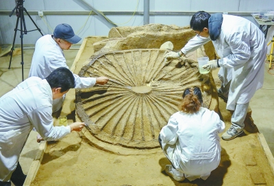 2018年12月6日,考古人员对河北行唐故郡东周时期的车轮实施保护。 新华社/TAKEFOTO