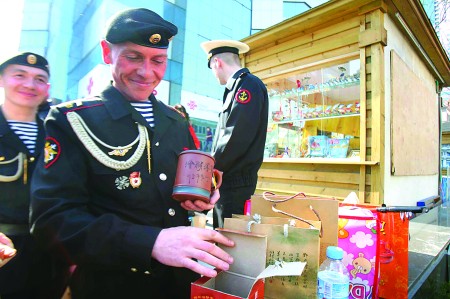 几名从俄罗斯来青参加海军节的水兵来到中山路上购物,其中一名水兵还买了一个大毛绒玩具和汽车模型,走在路上尤为显眼。记者和他用简单英语交流得知,他买的这个毛绒玩具要带回去送给只有 1个月大的儿子。