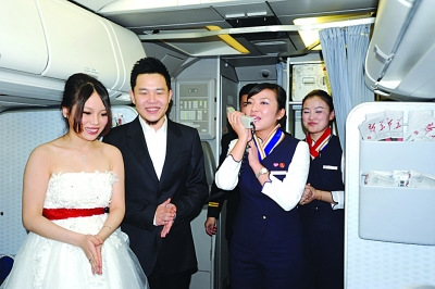 起飞15分钟后,飞行逐渐平稳了。乘务长潘忠威手拿客舱中的话筒客串起了婚礼司仪。“今天是一对亚运新人的幸福航班,我们将在蓝天下见证他们的爱情。”六七台摄像机、相机立马围了上去,将头等舱和经济舱连接处围得水泄不通,众位亲友团的成员们按捺不住也跑上前看热闹。
