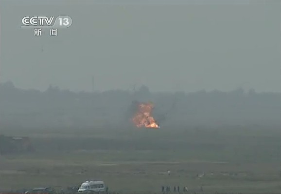 央视视频截图 14日上午,2011中国国际通用航空大会在陕西蒲城举行飞行表演时,一架飞豹战机出现意外坠机,人员伤亡不详,目击者看到有人跳伞。 |