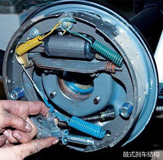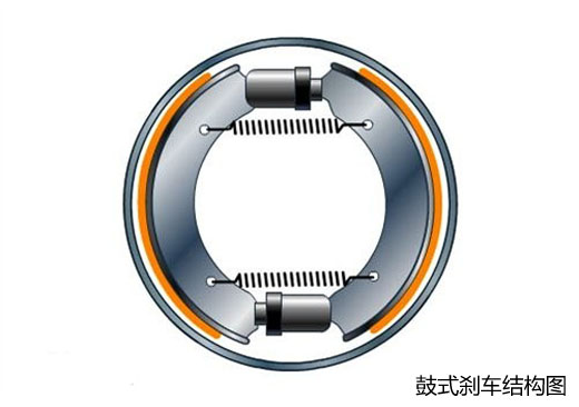 鼓式刹车由刹车底板、刹车分泵、刹车蹄片等有关连杆、弹簧、梢钉、刹车鼓所组成。它是利用液压将装置于刹车鼓内之刹车片往外推,使刹车片与随着车轮转动的刹车鼓之内面发生摩擦,而产生刹车的效果。鼓式制动就像是一个水桶,将手伸入旋转水桶时,就等同于刹车蹄片,只要手臂往水桶内壁一撑,凭借摩擦就能使旋转的水桶停下来。