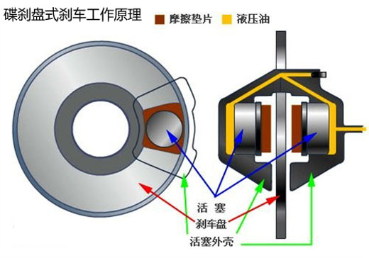 鼓式刹车的刹车鼓在受热后直径会增大,而造成踩下刹车踏板的行程加大,容易发生刹车反应不如预期的情况。此外,刹车系统反应较慢,刹车的踩踏力道较不易控制,不利于做高频率的刹车动作,频发刹车还会减低刹车性能,甚至失灵发生意外。 什么是“碟式制动”? 碟式制动是由一个与车轮相连的刹车圆盘和圆盘边缘的刹车钳组成.刹车时,高压刹车油推动制动块使之夹紧刹车盘从而产生制动效果。碟式制动的工作原理可用一只碟子来形容,用拇指和食指捏住旋转的碟子时,碟子也会停止旋转。 当踩下刹车踏板时,刹车总泵内的活塞会被推动,而在刹车油路中建立压力。压力经由刹车油传送到刹车卡钳上之刹车分泵的活塞,刹车分泵的活塞在受到压力后,会向外移动并推动刹车片去夹紧刹车盘,使得刹车片与刹车盘发生摩擦,以降低车轮转速。