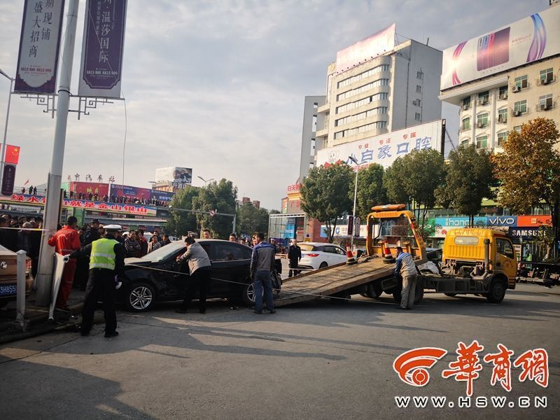 11月3日下午2时35分许,汉中市区中心广场转盘发生一起车祸:一辆105路公交车在经过转盘时失控,连续撞上多车和行人,造成2死5伤。 现场多车被撞损毁严重 3日下午3时许,华商报记者赶到事发现场时,伤者已被送往医院救治,一辆车牌号为陕F51061的105路公交车停在路中间,与一辆白色私家车撞在一起,公交车前保险杠被撞断,前挡风玻璃破碎,在公交车尾部,一辆自行车被压变形,地面上还残留着血迹。 转盘西南角的护栏被撞烂,护栏内侧停放的多辆私家车都有被撞击的痕迹。救援人员正将一辆黑色的私家车拖走,旁边一辆出租车与一辆银白色SUV也损毁严重。 据目击者提供的一段行车记录仪显示,这辆105路公交车从转盘北侧由北向南逆时针行驶,出现在视频中时车速很快,直接撞上了前方正在行驶的一辆出租车和一辆银白色SUV,又向路边停车场撞去,并最终冲到转盘南出口后才停了下来。而整个事故的发生,还不到10秒钟。