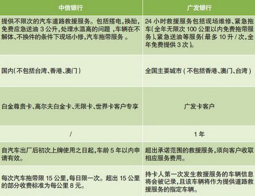 记者点评 优势:救援范围广“临危之际”发现,平时刷卡消费的金卡竟然挺身而出,将困顿轻松化解。由于银行在全国均有网点,因此服务范围也遍及除港、澳、台的全国范围,车主即便外地出行也很方便;而由于与专业服务机构合作,因此救援也具有专业性;此外,相比专业救援俱乐部,这种方式费用不算高。不足:客户具有针对性只是针对卡友,而且有的需要一定级别的卡友才能享受这项服务。另外,需要特别提示卡友的是,部分银行卡等产品虽然自带救援或者送燃油等功能,但是一定要卡主事先通知机构,自行开通。否则出现问题时现场求助,则往往会吃到需要N个工作日之后开通的闭门羹。看来“临危授命”的前提,一定是要防患于未然。 信用卡道路救援细则