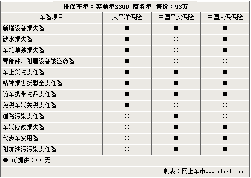 奔驰新S级轿车继上海车展全球首发后已于日前正式上市,全系8款车型售价为93万元-259.8万元。那么在购买奔驰新S级轿车后,其保险又将如何选择呢?下面我们将北京地区太平洋(601099,股吧)、平安、中保三家保险公司对奔驰新S级轿车入门车型的投保费用进行详实解析,以便为您购车提供一定的参考。 一、主要险种及附加险种费用