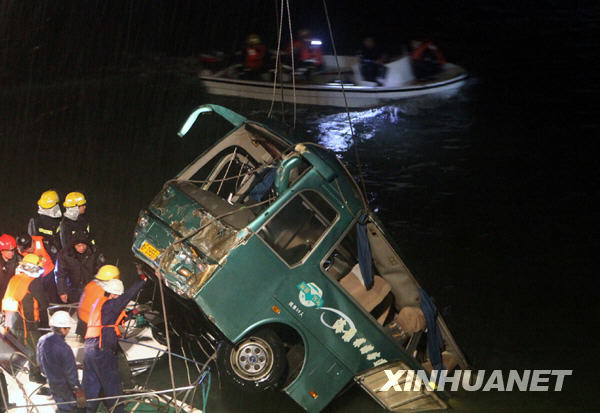 据坠海现场救援指挥人员介绍,经过各方共同努力,失事客车最终被打捞出水,车内剩余的11名遇难乘客遗体随客车被全部打捞出水。加上此前确认的2名死者,此次事件共有13人遇难。