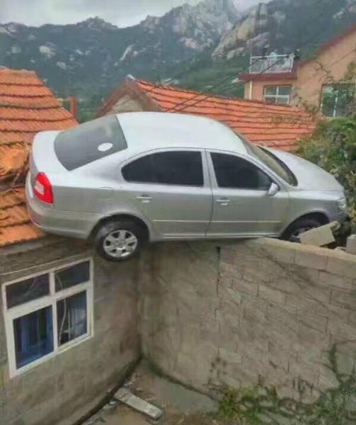 青岛崂山区雕龙嘴村。一司机倒车倒大了,冲上了村民的屋顶。