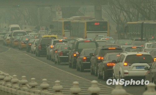 一月十九日,北京下降气流影响下,大雾笼罩,能见度降低。中新社发邹宪摄