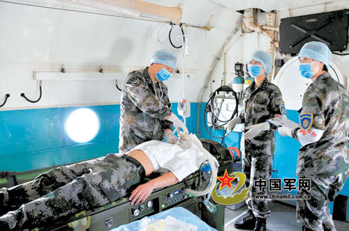 医护人员在卫生飞机上进行救援。 赵建强摄 一场联合演练近日在西北某地域激烈上演。笔者看到,随着高强度对抗加剧,一批重“伤员”正紧急向一架尾部带有红十字的运输机上转移。空后卫生部领导告诉笔者,这是我军首架空运后送卫生飞机,它的投入使用,将对战场伤员的生命营救赢得宝贵时间。 笔者紧随医护人员进入机舱,看到机舱内分为重症监护区和医疗后送区,装有一排排多层特制病床,医护人员忙而不乱、紧张有序,分别把经过检伤分类的“伤员”固定在病床上,随即进行输液、吸氧、生命体征监护等救护行动。数分钟后,飞机起飞后送伤员。 航空医疗救援以其反应迅速、快速救援、受作业地域影响小的特点,已经成为世界各国应急医学救援的主要手段,各发达国家和军队都已经建立了完善的航空医疗救援体系。我军卫生飞机以空军某型运输机为平台改装而成,机上可配备5-7名医护人员,可满足2名重症伤员的连续医学监护和应急救治,具备39名担架伤员、15名座位伤员的医疗后送能力。 卫生飞机穿云破雾,在空中上演了一场“生命大营救”。笔者看到,机舱内手术台和各类先进救治仪器一应俱全,医护人员在空运后送途中忙着为“伤员”实施连续性输血、输液等操作,并对“重伤员”实施心肺复苏等紧急情况处置。 专家评定,这架卫生飞机可基本满足批量伤病员的远程空运医疗救援需要,标志着我军航空医疗救援体系迈出了重要一步。 |