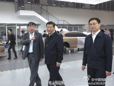 【习近平上海试坐自主品牌汽车】习近平来到上海汽车集团技术中心。车间停放着几辆自主品牌汽车。听说荣威950是中高端自主品牌车,他询问汽车排量、价格。“我来坐一下”,看到后排车门打开,他弯腰坐进去体验。他对企业负责人说,中央已经作出决定,公务车都要用国产车,这对自主品牌汽车是个机会
