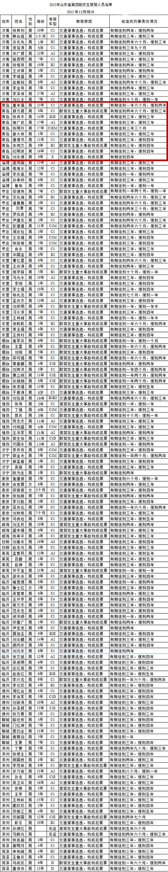梳理发现,这147人中有34人是酒司机肇事构成犯罪,占总数的23%,其中12人酒驾,22人醉驾。其它113人都是肇事逃逸构成犯罪。其中驾龄最长的是一名开了27年车的老司机,而最倒霉的要属济南的一名男子,拿证一个月就被终身禁驾了。 在驾驶证类型上,有35人持A、B类驾驶证,持C类证的最多达107人,3人持D、E类摩托车证,另外还有2人无证驾驶。被终身禁驾的147人全部被判有期徒刑,量刑最轻的也有“六个月,缓刑一年”,而这里面获刑最重的是滨州一名驾驶员,他无证酒驾发生事故构成犯罪,被判处有期徒刑5年6个月。 |