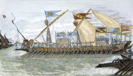 从公元前三世纪,以及其后的五百年间,地中海变成了一个由定期商业帆船队和各怀鬼胎的海军舰队穿插驰骋的大湖。最后,罗马人成了地中海的霸主。开始时,由于正处于罗马文化的开创时期,罗马人的主要精力集中在陆地,而非海洋。但是,由于政治上的扩张野心和欲望,加上社会的发展客观需求,使得他们很快感到必须解决海上力量的问题。他们下了决心,大约化了100年的时间就成了海上的霸主――其作用和地位大概只有大约二千年后的英国海上霸权才能够相比较。当然,罗马人缺乏自身的海事经验,但是他们充分利用了希腊人和腓尼基人的传统。在取得了腓尼基人军舰的实样和制造技术后,再加上希腊人的经验,罗马人建立了自己的舰队。事实证明,罗马人是“青出于蓝而胜于蓝”,他们发展了风帆航行技术,就像英国人在以后所作的贡献那样。他们发明了多根桅杆和斜桁帆。经过了几个世纪的努力,罗马人的货船已经逐步增大到能够载货1600吨,以6节的速度来作横跨地中海的航行。这样的速度在今天的人们看来是十分可笑的,但是,你不要忘了这是在距今两千多年前的过去。
