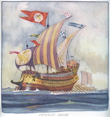 正是在威尼斯,“加莱”船型达到了其发展的最高阶段,它的设计、保养和划桨技术都已到了其内涵近乎完美的顶点。在14世纪,成立了一些承担成批制造和保养“加莱”船复合职能的兵工厂。这里储存着大量的备件备品,到了战时,在两天时间里就可以配备完整用来打仗。