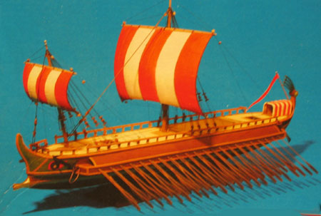 一般的西洋帆船史说到地中海桨帆船时,总是从腓尼基(位于今日黎巴嫩一带)开始的。但是,在笔者的心中,腓尼基人和腓尼基船始终披着一层神秘的面纱。你看,腓尼基人创造了腓尼基字母――这是欧洲拼音文字的老祖宗,可是他们却没有记载下自己的历史――他们的许多历史是希腊人记载的;他们在地中海流域开辟了不少殖民地,可是却找不到一个以腓尼基民族为主体的国家;他们有发达的手工业,可以染出五光十色的布匹,可是,只落得把紫红色成为了自己民族的代码(在希腊文里,“腓尼基”的意思就是紫红色);他们有非凡的航海能力,但是,他们的环绕非洲的探险航行只不过是为埃及人打工而已;他们教会了希腊人怎样造船,自己却和同样在航海史上曾经辉煌一时的克利特人一样,象流星一般在历史的长河里湮灭了。我们现在也难以看到腓尼基船的具体形象,而只能从师承腓尼基船的希腊船身上来反推腓尼基船应该是何等模样。