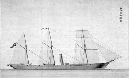 与中国福建船政的情况类似,当时东瀛岛国日本发展自己的舰船建造工业,同样也是在法国总工程师和技术的支持下,在“万年清”问世多年之后,1876年6月21日,日本横须贺造船所下水了一艘与“万年清”非常相像的军舰——炮舰“清辉”。这艘在法国工程师指导下完成的军舰排水量897吨、长63.1米、宽9.1米、吃水3.9米,装备1台蒸汽机,单轴推进,功率443马力,航速9.6节。可以看到“清辉”舰长不及“万年清”,宽度却大于“万年清”,长宽比上显然不如“万年清”更适宜快速航行。此外,“清辉”的主机功率不及“万年清”,航速也低。与这艘比“万年清”迟到了几乎6年的军舰相比,就能看到船政建船最初的技术起点,在这一刻,中国的近代蒸汽舰船建造水平超越在日本之上。