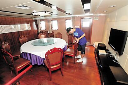 ![]() 今天如果海上天气条件许可,市民可在奥帆中心至栈桥一带的近岸海域上看到青岛海上旅游有史以来最大的游船。记者昨日获悉,青岛轮渡公司所属渡轮向海上游船变身的第一艘、排水量2330吨的“鲁胶渡10号”渡轮,华丽转身改成游船“蓝海明珠”后,计划今天完成首次客运航线试航。昨日下午,在奥帆中心内码头,记者走近静候试航的“蓝海明珠”。 变身:客舱变豪华舞厅 即使经常乘坐轮渡的乘 在二层客舱,记者发现这里已经变成了一个多功能厅,厅内设有吧台和一个圆形舞池。多功能厅的四个角上都安装有42寸的液晶电视,中央位置搭设了一个舞台,并配备了音响以及点歌设备。在多功能厅的出口位置设有自助餐台以及吧台,可以提供各类休闲小吃和酒水。在原来客舱露天区域已经改造成带有罩棚的休闲观光平台,放置了轻便座椅和圆形小桌。 此外,游船上还有商会会议室和高档餐厅包间。