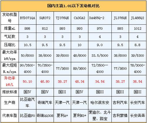 目前市场上的主流1.0L机型有以下几种:BYD371QA、SQR372、TJ376QE、CA3GA2、DA465Q-2、JL376QE和JL465Q等。那么这些款发动机究竟如何衡量其先进与否呢? 通常,我们衡量一款发动机的好坏要看它的动力性和经济性,也就是说发动机要具有较好的功率、良好的加速性和较低的燃料消耗量。对于经济性说白了就是省不省油,而对于动力性很多消费者在认识上存在一定的误区。很多人通过看最大功率和最大扭矩来确定发动机动力的好坏,对于相同排量的发动机,谁的最大功率大,谁的动力性更好,这个基本正确,但对于不同排量的发动机就不能这么看了,要看“升功率”。 升功率表示了单位气缸工作容积的利用率,升功率越大表示单位气缸工作容积所发出的功率越大。因此不是功率和扭矩越大的发动机就越好,真正能够反映发动机动力的指标是每升气缸工作容积所发出的功率,即“升功率”。 除了以上列举的发动机外,还有韩国大宇生产的F8CV3直列三缸和B10S13直列四缸发动机,它们分别装配在乐驰0.8和乐驰1.0上,升功率分别为47.11kW/L和47.24kW/L。另外,吉利熊猫尚未上市的1.0车型将搭载自主研发的JL3G10发动机,采用CVVT技术,其排气量为1006mL,最大功率为52kW/6000rpm,最大扭矩为91N.m/3400rpm,发动机的压缩比为10.5,升功率达到了51.69kW/L,排放标准为国IV,是一款非常值得期待的发动机。