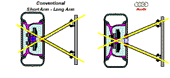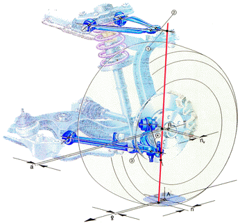 接着我们看看奥迪A4是怎样消除扭力转向的,新Audi A-4 四分连结是以在轮子的中线放置转向轴,其他汽车制造厂也曾试着以别的方式来解释同样的问题。Honda以及其他日本和美国的汽车制造厂曾经试着将转向关结弯曲在轮胎上方,将上支臂(上控制臂)球接头移至接近轮胎的中线。