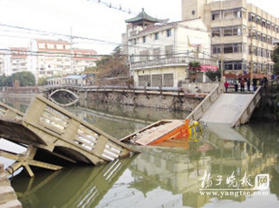 当天上午记者来到事发现场后发现,桥的两端已经完全断裂分别斜入水中,桥中间一辆黄色的自卸王卡车静静地躺在水里,河水已经漫过车窗玻璃,露出一小段空间,车上满载着水泥石块等建筑垃圾。河两岸有工人正在搅拌水泥砂浆,用砖块砌出两堵墙将桥口封住。据记者现场目测,这座桥宽5米,跨度约40米。一位50多岁的王师傅告诉记者,夜里一两点钟左右,他在睡梦中突然听见“轰”的一声响,起初以为隔壁工地拆迁的声音。随后,他起床上公共厕所时才发现小桥周围有几辆警车的警灯一直在闪,走近一看,才发现桥断了,河里有一辆汽车。而从裸露在外的车窗玻璃判断,车内的人员已经胜利逃脱。