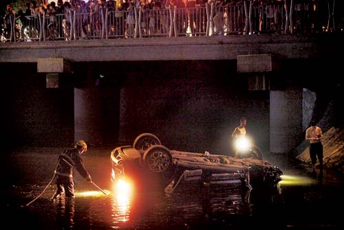 逆行先后撞两车 自行爬出连呼救保时捷司机—— 驾车冲进河“酒仙”桥下磕头 昨晚11时3分,在坝河酒仙桥下,一辆保时捷凯宴冲进了半米深的河中,翻了个四脚朝天。 水中,先伸出一只胳膊,接着30岁左右的男司机从驾驶室钻出,随后站起来,个头足有1米8。 他满身泥水,全身散发着浓重酒气,站在河水里随着人声大喊。 昨晚11时,他驾着黑色保时捷在酒仙桥路上高速行驶时,突然闯入逆行道,撞上两辆车后,栽到坝河半米深的水中。 因为事发酒仙桥,围观的居民将坠入河中满身酒气的司机称为“酒仙司机”。 “车里还有三个!”神志不清的司机突然扑通一声跪在水里,朝着自己的黑色爱车磕了近十个头,再左右手开弓,边扇自己大嘴巴边吼:“我错啦,我错啦……” 随后的半小时里,消防队员在河底摸了个遍,也没找到他说的3个人。随后,他被送往医院。 凌晨1时,经过2小时的救援,坠河车辆被打捞上岸。警方仍在对司机是否酒驾进行调查。