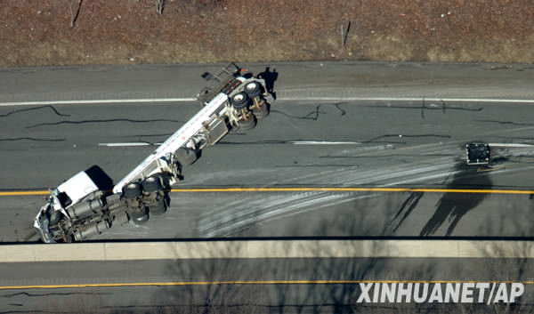 3月21日,一辆运载大量有害化学物氢氟酸的卡车在宾夕法尼亚州东部翻车并发生泄漏,附近大约5000名居民被紧急疏散。除了卡车司机受轻伤外,目前暂无关于其他人员伤亡的报道。这是翻车事故现场。 新华社/美联