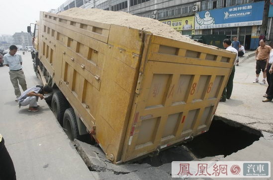 武昌白沙洲大道武泰闸路段,司机戴师傅驾驶一辆满载黄沙的翻斗车经过事发路段,路面突然塌陷,车中后部陷至地下。直到下午5时许,在转运完一车黄沙后,翻斗车才被吊车吊出大坑。