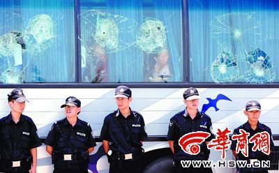 ![]() 昨日,情绪激动的死者家属砸裂大巴车窗,不准乘客下车。为防止发生意外,特警围在大巴四周保护