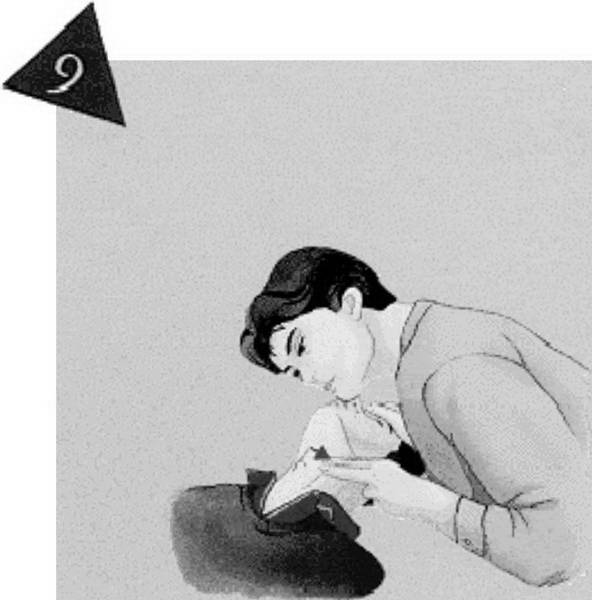 注:按压速度80~100下/分钟,人工呼吸每5秒一次。每次按压都要数数以配合按压速度,口诀:一下——十下,念“一”时手下压,念“下”时手放松,念“二”时手下压,念“下”时手放松,如此交互念至10下。十一,“十”压,“一”松,“十”压,“二”松……这样念到十五。