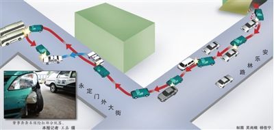 当刘冬驶出车库后,她开上了物美大卖场外的安乐林路。晚7点左右,韩先生正在那条路上等待绿灯通行,突然听见“嘣”的一声,车尾被后面的一辆车猛地撞了一下。韩先生说,随即,后车接连撞击他的车七八下,直至将他推出红绿灯等待线,“幸好当时南北向没车,不然我就没命了。”