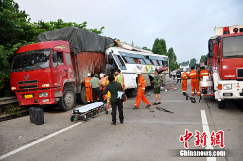 7月1日5时许,泉南高速公路(福建泉州——广西南宁)高速公路广西南宁境内,一辆载客43人的大客车严重追尾停在路边的一辆大货车,事故至少造成2人当场死亡,20余人被送往医院救治。