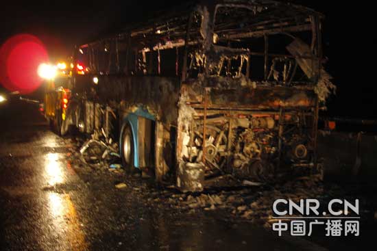 15分钟后,辖区2辆消防车、高速施救车、高速巡查车相继赶到现场进行灭火处置和示警工作。因现场火势凶猛,难以扑灭,随后辖区溪口消防队又增派了一辆消防车赶到现场继续进行灭火,大火在20时40分被完全扑灭,此时大客车已成一堆废铁,完全报废。