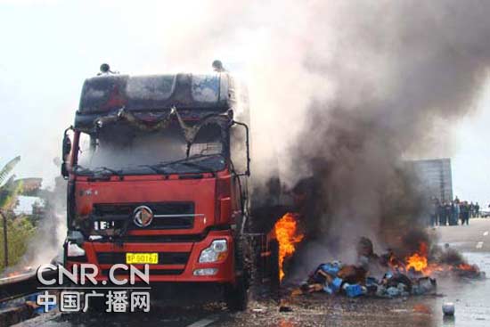 据悉,事故车辆装载了一批机器、原料和塑料制品,从广东汕头开往上海。目前,事故原因和具体损失正在调查。